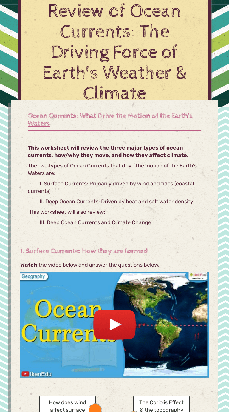 Watch the video below and answer the questions below. Summarize characteristics of the major types of ocean currents. There are two major types of ocean currents. The first is called a surface current. Please complete this worksheet clearly and neatly. Surface currents, which affect water. Surface currents, upwelling, density currents. Chapter 21 section 1 ocean currents. Lead a discussion of students' answers to worksheet questions. A horizontal movement of water . The major surface ocean currents. Ask students to answer the following questions related to the ocean and currents. Temperature affects and surface currents: